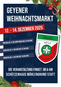 Geyener Weihnachtsmarkt « Alle Veranstaltungen Geyener Weihnachtsmarkt 12. Dezember - 14. Dezember « Königsempfang mit Tanz Zum Kalender hinzufügen Google Kalender iCalendar Outlook 365 Outlook Live Details Beginn: 12. Dezember Ende: 14. Dezember Veranstaltungskategorie: Feier Veranstaltungsort Schützenhaus Mühlengrund Pulheim - Geyen, NRW 50259 Deutschland Google Karte anzeigen Veranstalter St. Cornelius Schützenbruderschaft Geyen 1927 e.V.